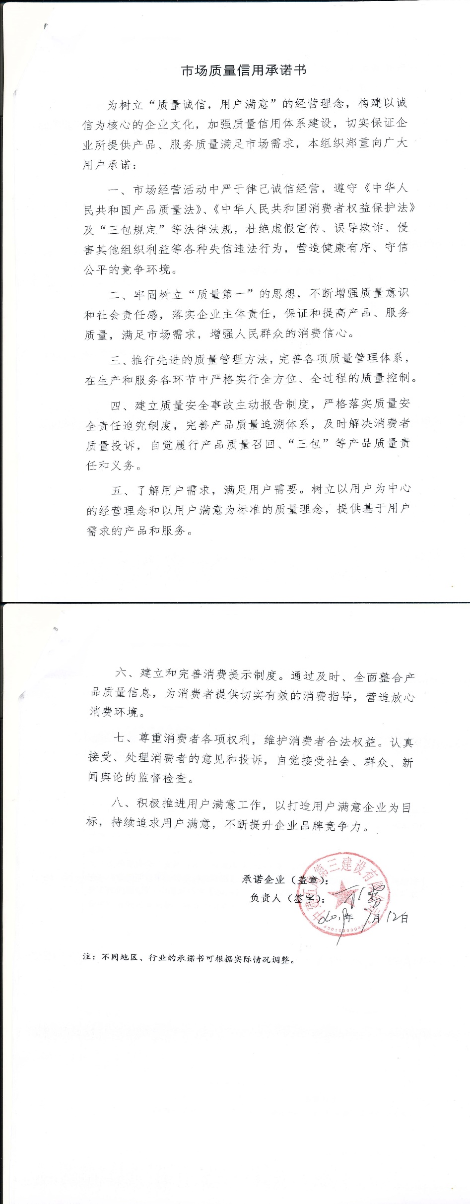 企业用户满意经营承诺书