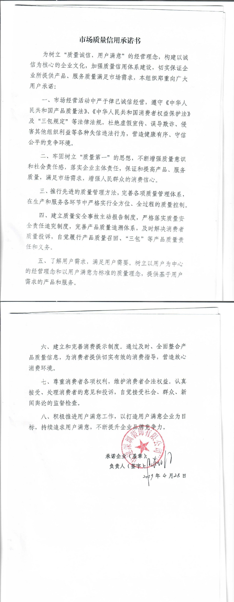 企业用户满意经营承诺书