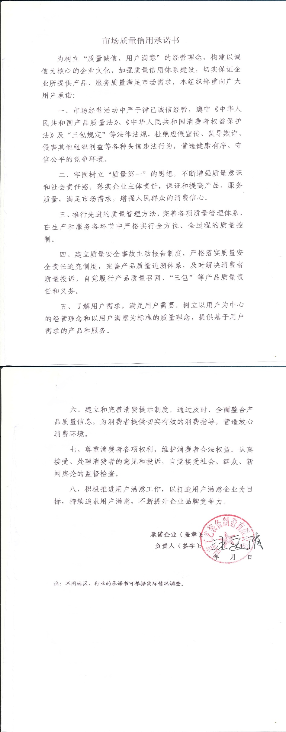企业用户满意经营承诺书