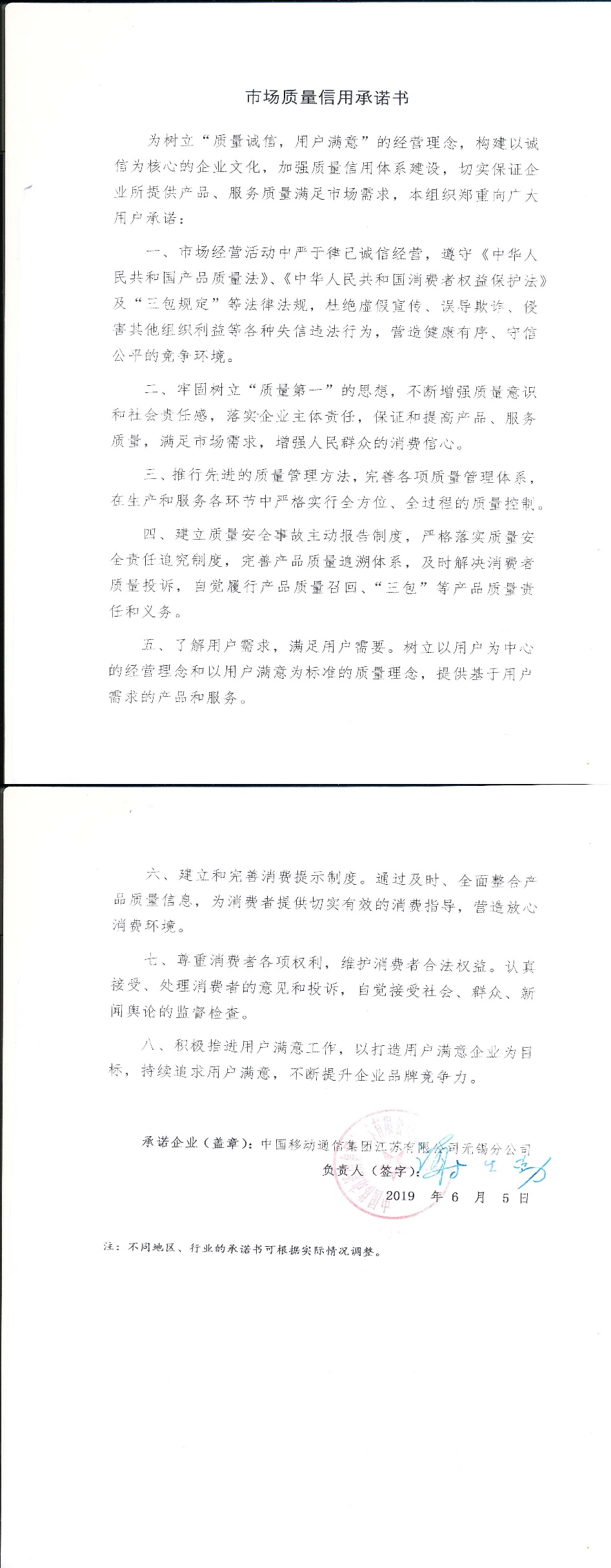 企业用户满意经营承诺书