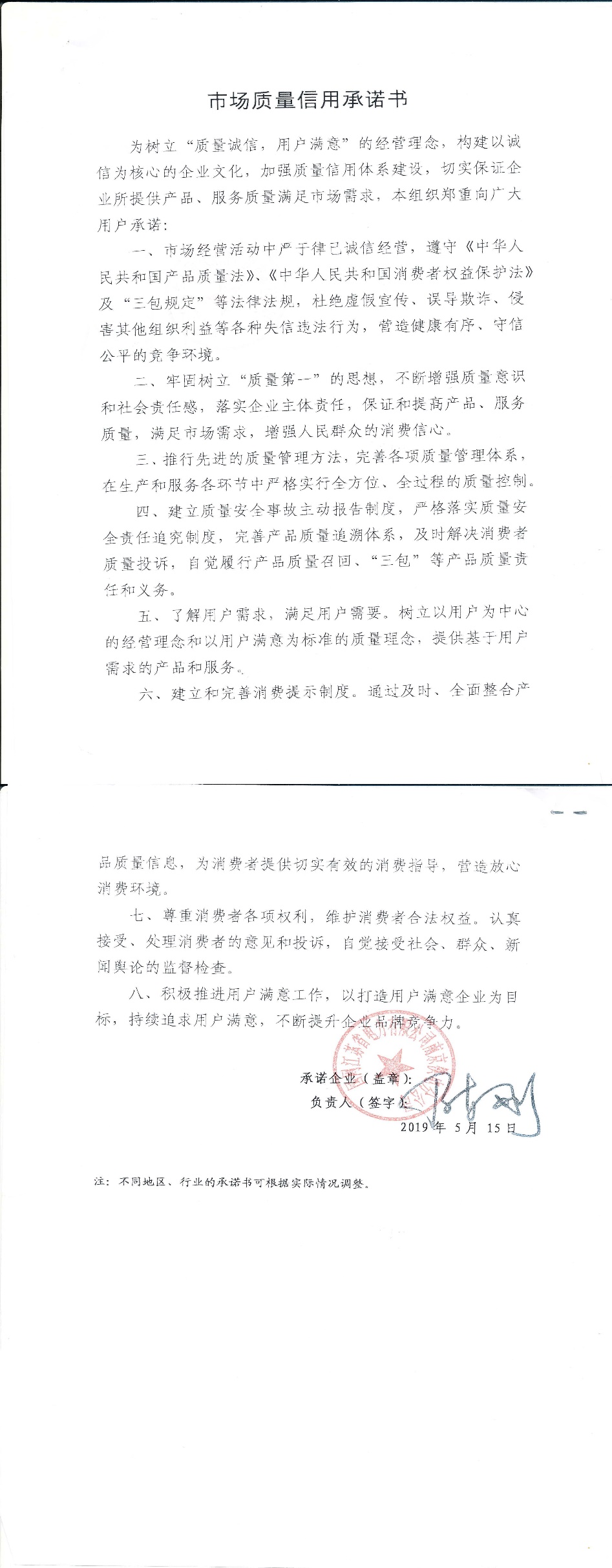 企业用户满意经营承诺书