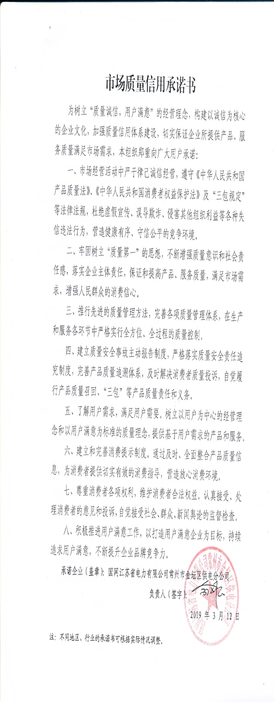 企业用户满意经营承诺书