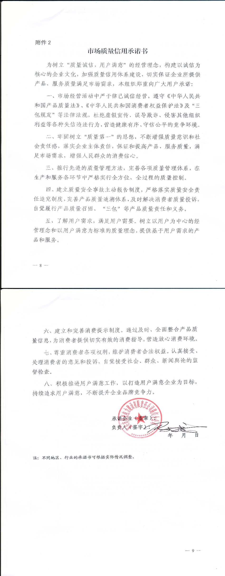 企业用户满意经营承诺书