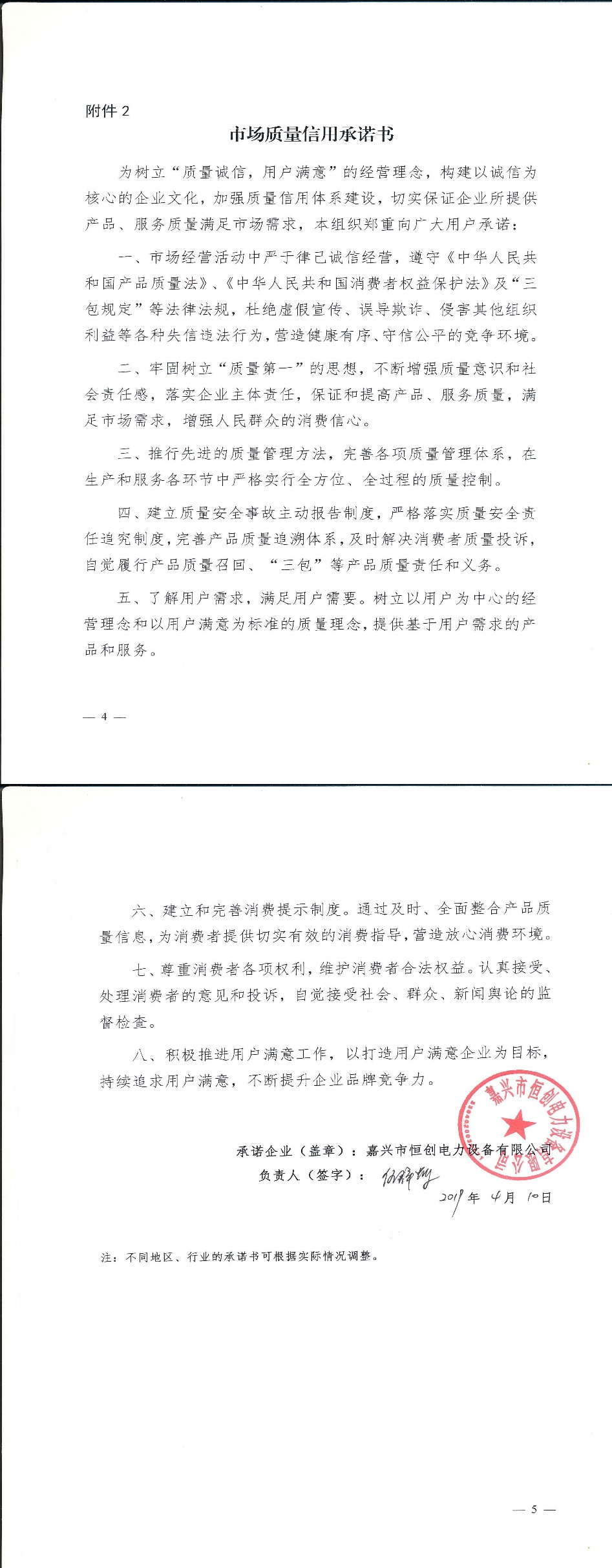 企业用户满意经营承诺书