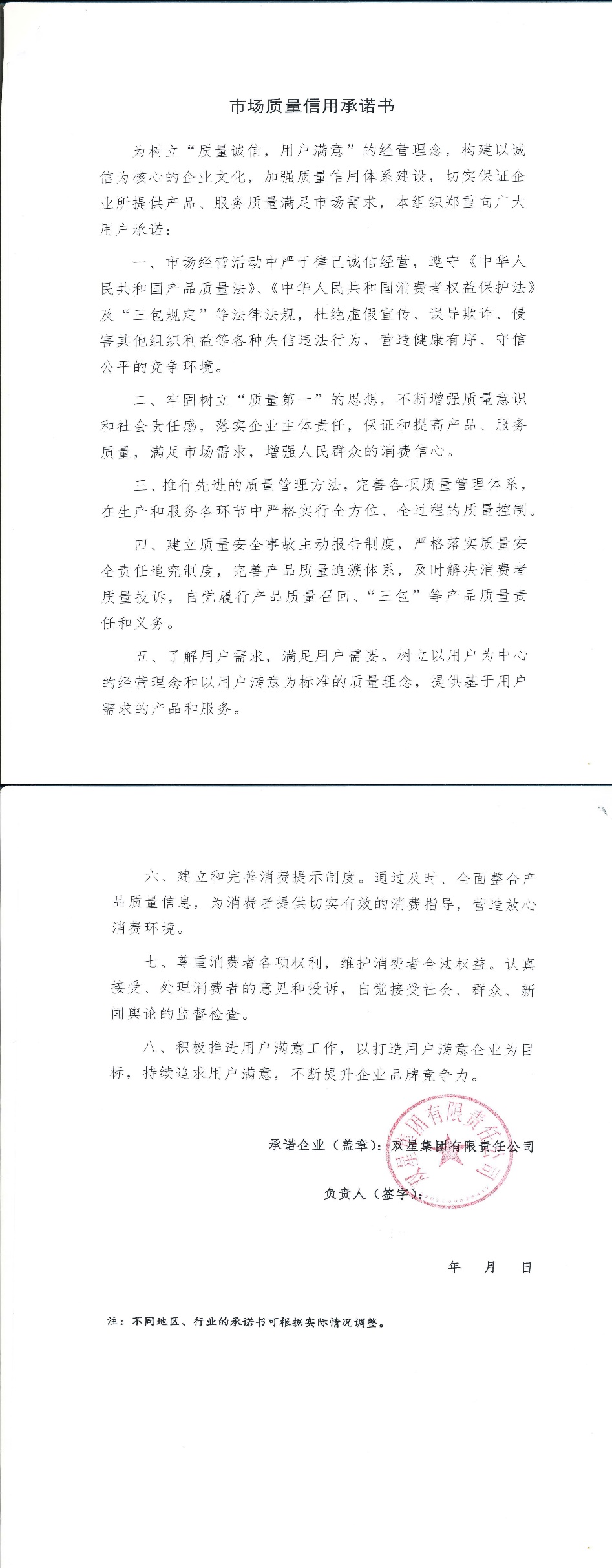 企业用户满意经营承诺书