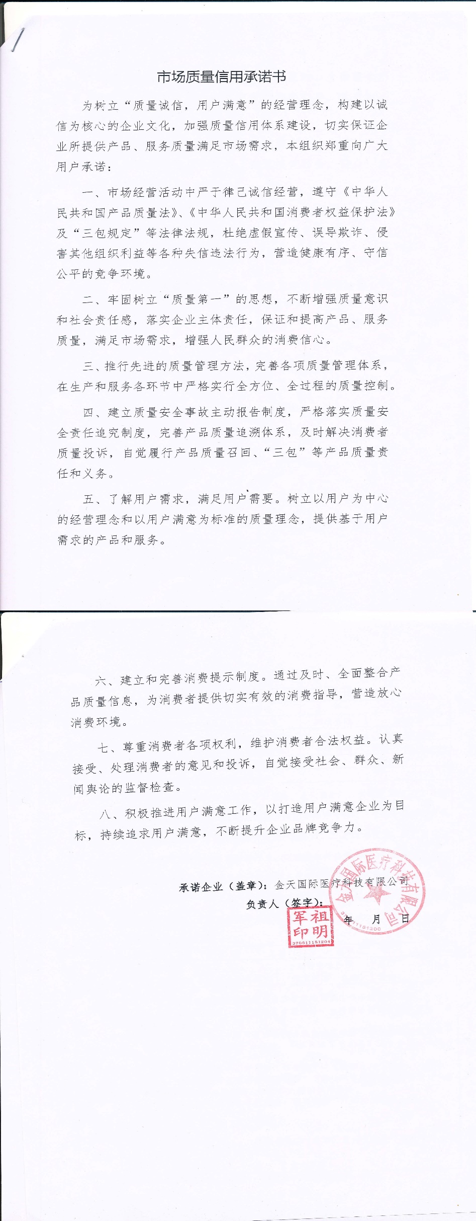 企业用户满意经营承诺书