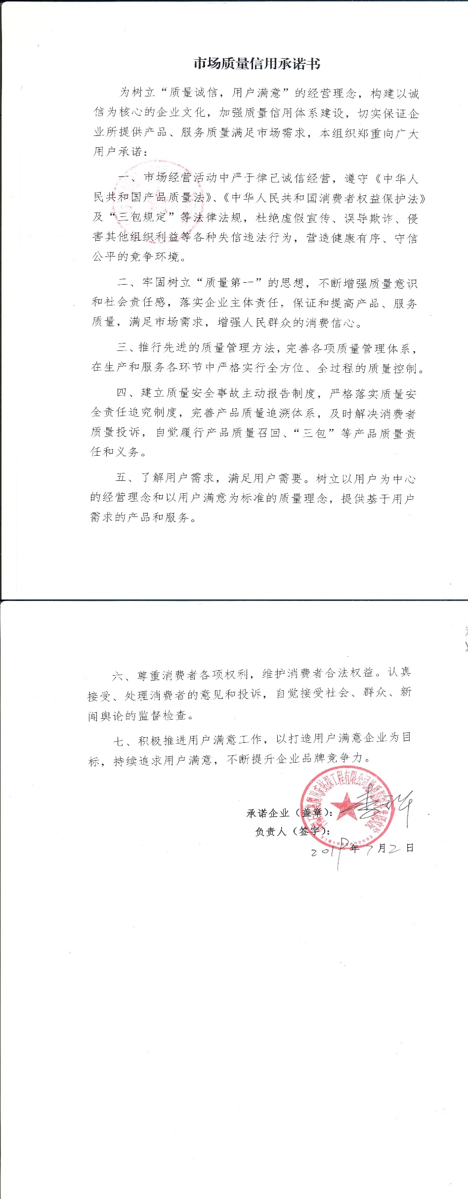企业用户满意经营承诺书