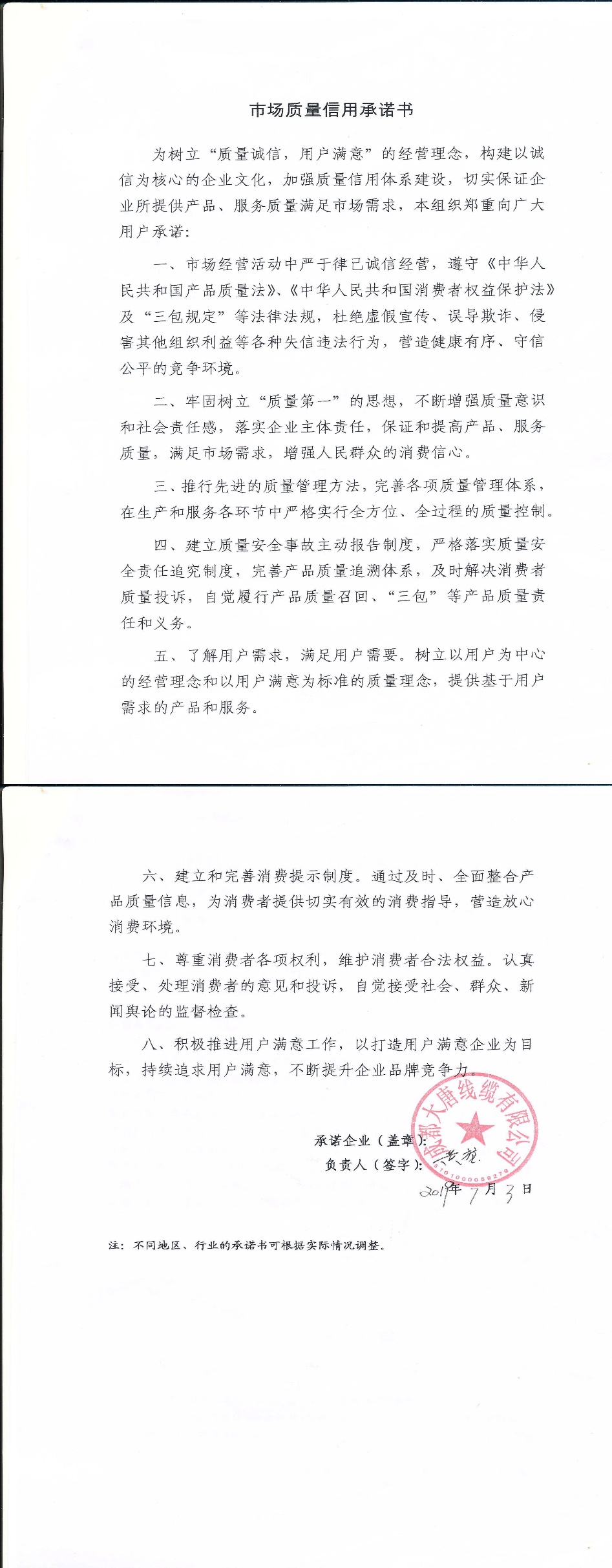 企业用户满意经营承诺书