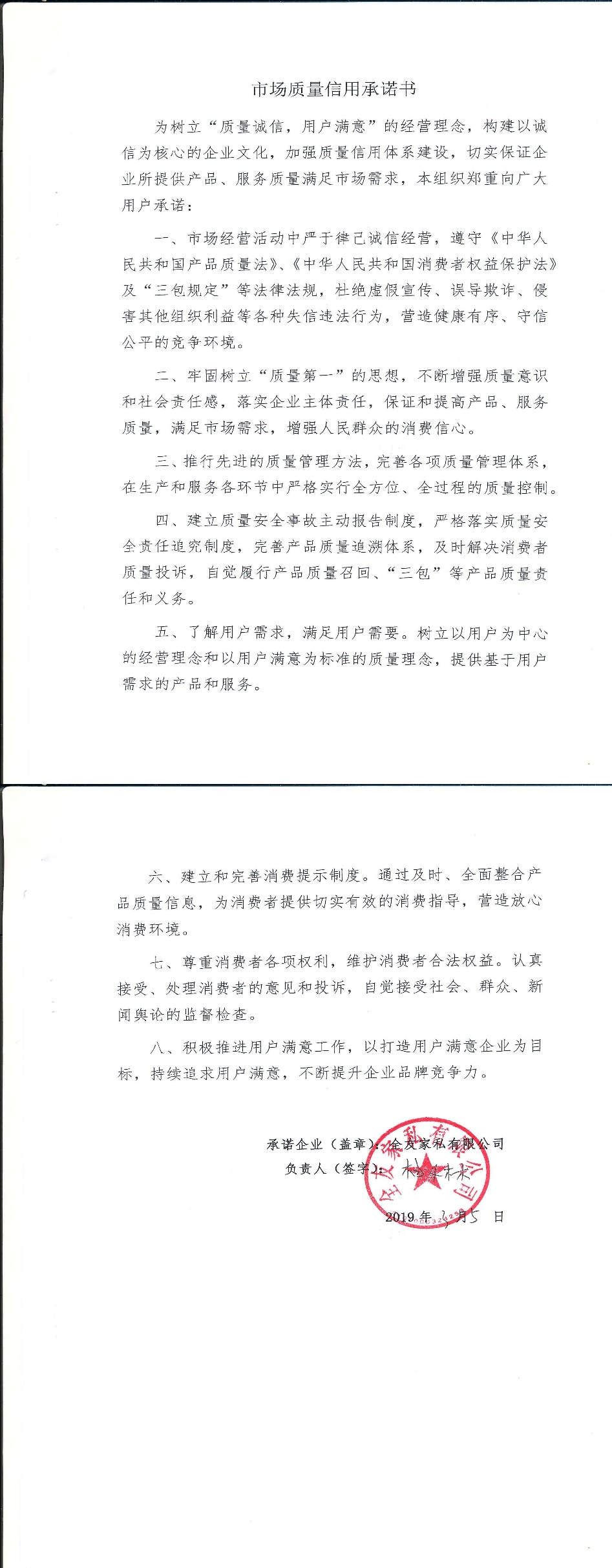 企业用户满意经营承诺书