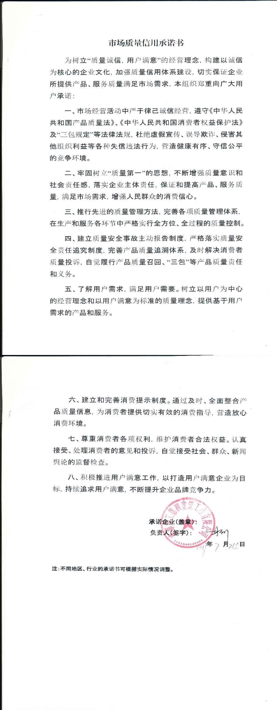 企业用户满意经营承诺书