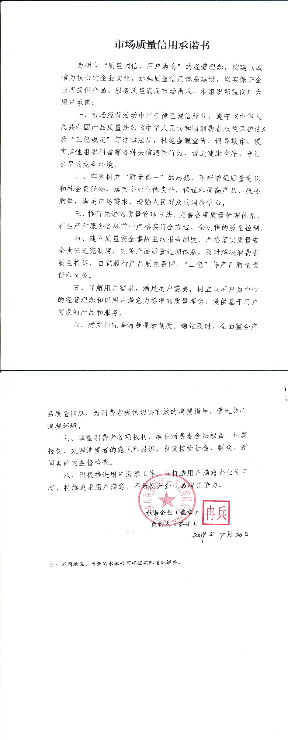 企业用户满意经营承诺书
