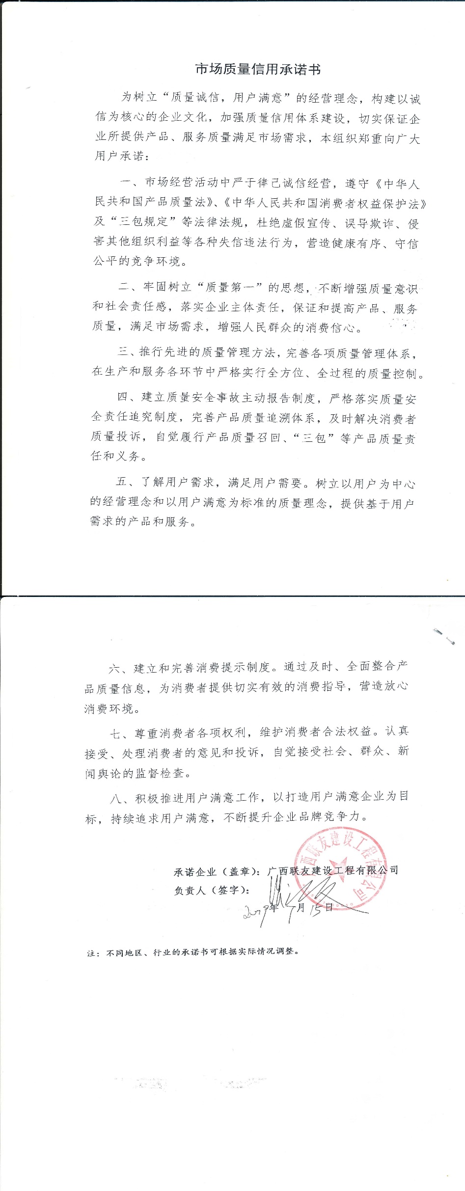 企业用户满意经营承诺书